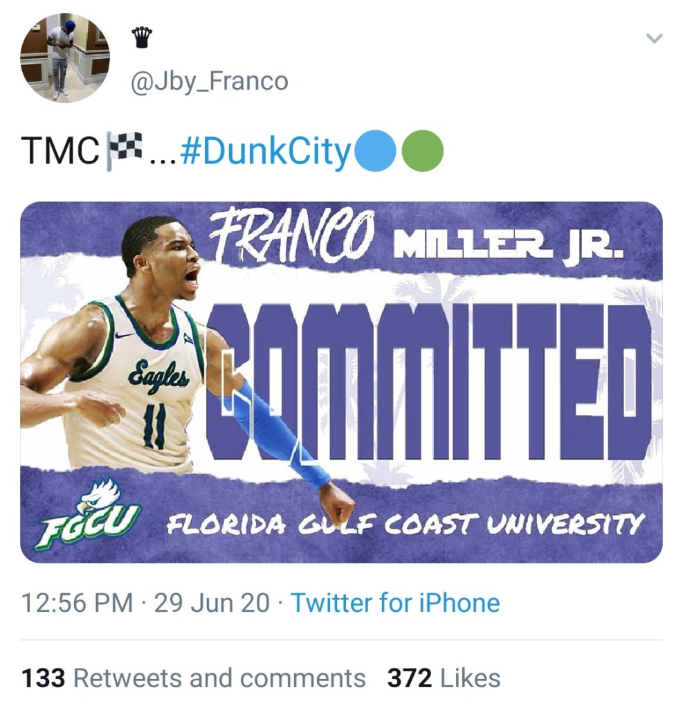 Franco also has a connection with a current FGCU player. As stated, he played his final year of high school and AAU in Canada. Jalen Warren, a rising senior for FGCU, also spent time in Canada. Coach Fly disclosed that “[Franco’s prep school was in Canada and he played multiple times against Jalen (Warren). Jalen told us that he always liked his game and had fun playing with him.“